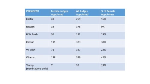 During the 2012 Presidential campaign, Republican candidate Mitt Romney was mocked for declaring that he had “binders full of women” ready to appoint to federal positions.  The phrase, while awkward, signaled Romney’s commitment to gender diversity in his appointments.  In contrast, President Trump’s appointments, from his US Attorneys to his executive appointments, have been overwhelmingly male.  This pattern is evident in his judicial appointments.