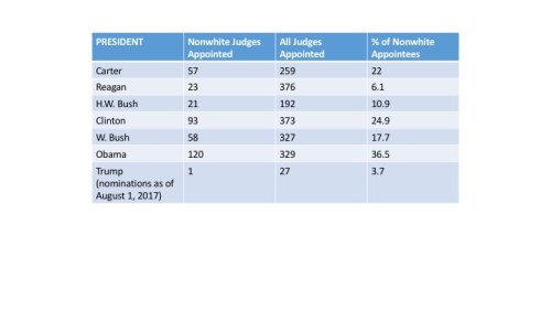 According to the Congressional Research Service (CRS), as of August 1, President Trump has nominated only one non-white judge to the federal bench: Judge Amul Thapar. (The nominees submitted on August 3d were not analyzed but are also overwhelmingly white).  This means that under 4% of Trump’s nominees have been racial minorities.  In comparison, 36% of President Obama’s judicial nominees were racial minorities.
